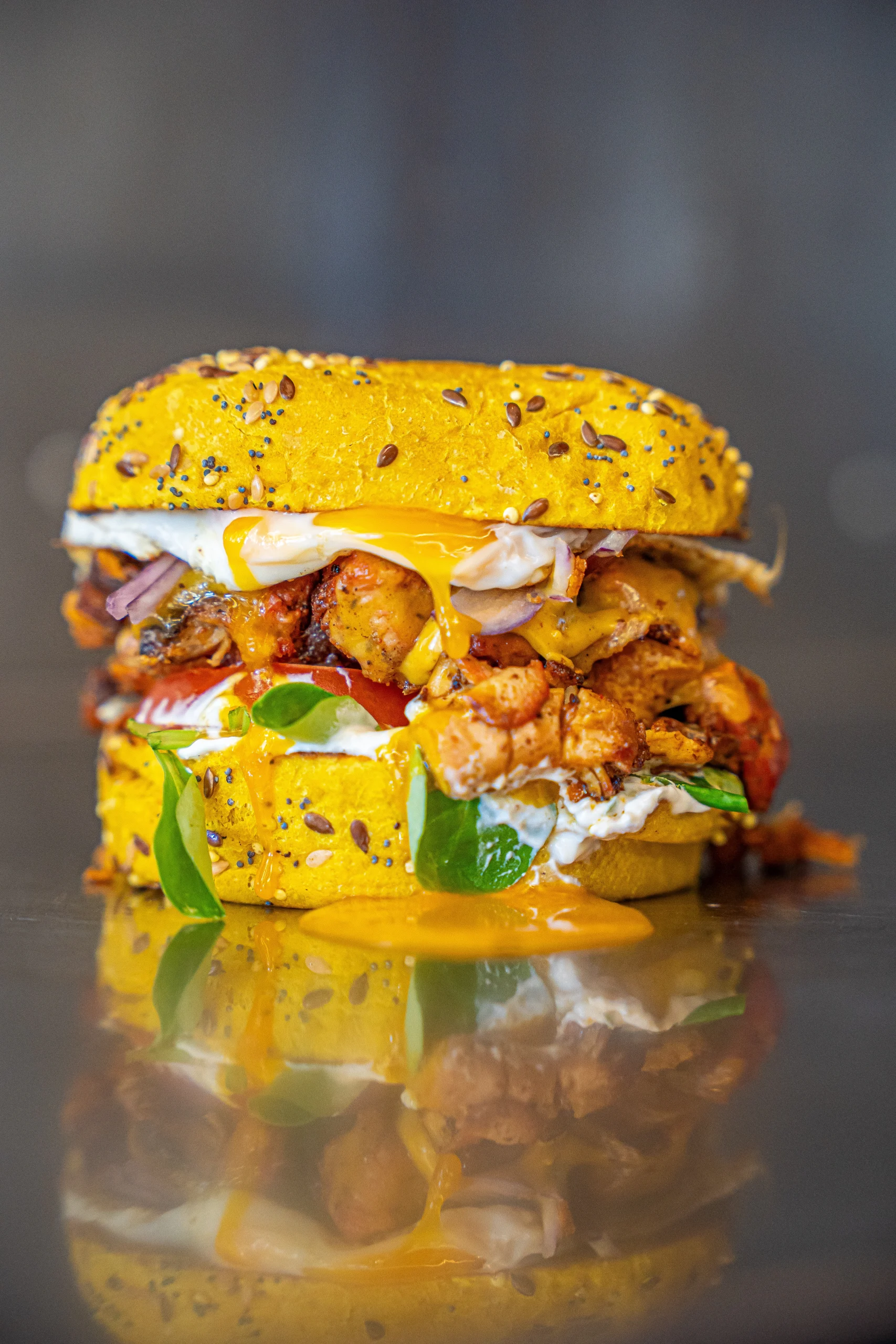 Poulet tandoori , double sauce Raïta , sriracha (relevées), cheddar maturé